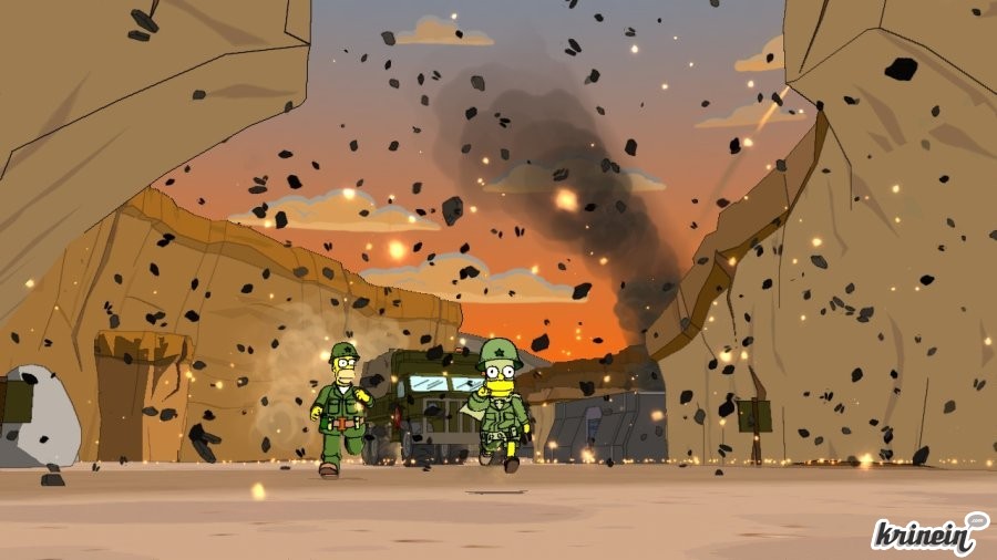 Ca sert à quoi le jaune? A faire du jaune.Quand l'envie vous prendra, vous pourrez choisir vos personnages en vous rendant à l'arrêt de bus et choisir une des nombreuses missions qui vous sont proposées. Chaque mission se joue à deux personnages dont un principal et un secondaire. Le but du jeu est de s'entraider à l'aide des pouvoirs spéciaux de chaque personnage pour débloquer la route à l'un ou à l'autre et atteindre les objectifs de la mission. Les objectifs allant de tout casser à tout manger, en passant par des combats épiques contre des super monstres imaginaires tirés de l'univers de Matt Groening, et ce dans des lieux tout aussi incongrus et divers ; vous ne trouverez à ce niveau là de l'aventure toujours pas une once de monotonie. Toutefois, si les missions peuvent se jouer autant en solo qu'à deux, le mode deux joueurs est conseillé pour mieux savourer l'esprit du jeu et les cinématiques franchement drôles qui l'accompagnent. Chaque stage est un mini-épisode, parfois drôle et cinglant, parfois hilarant et crétin, mais toujours critique comme le veut le sceau d'approbation Simpson. Le monde des jeux vidéo en prend d'ailleurs pour son grade à chaque coin de rue.